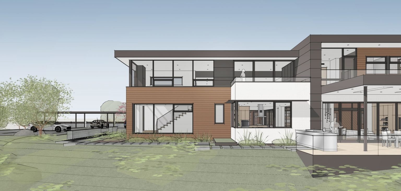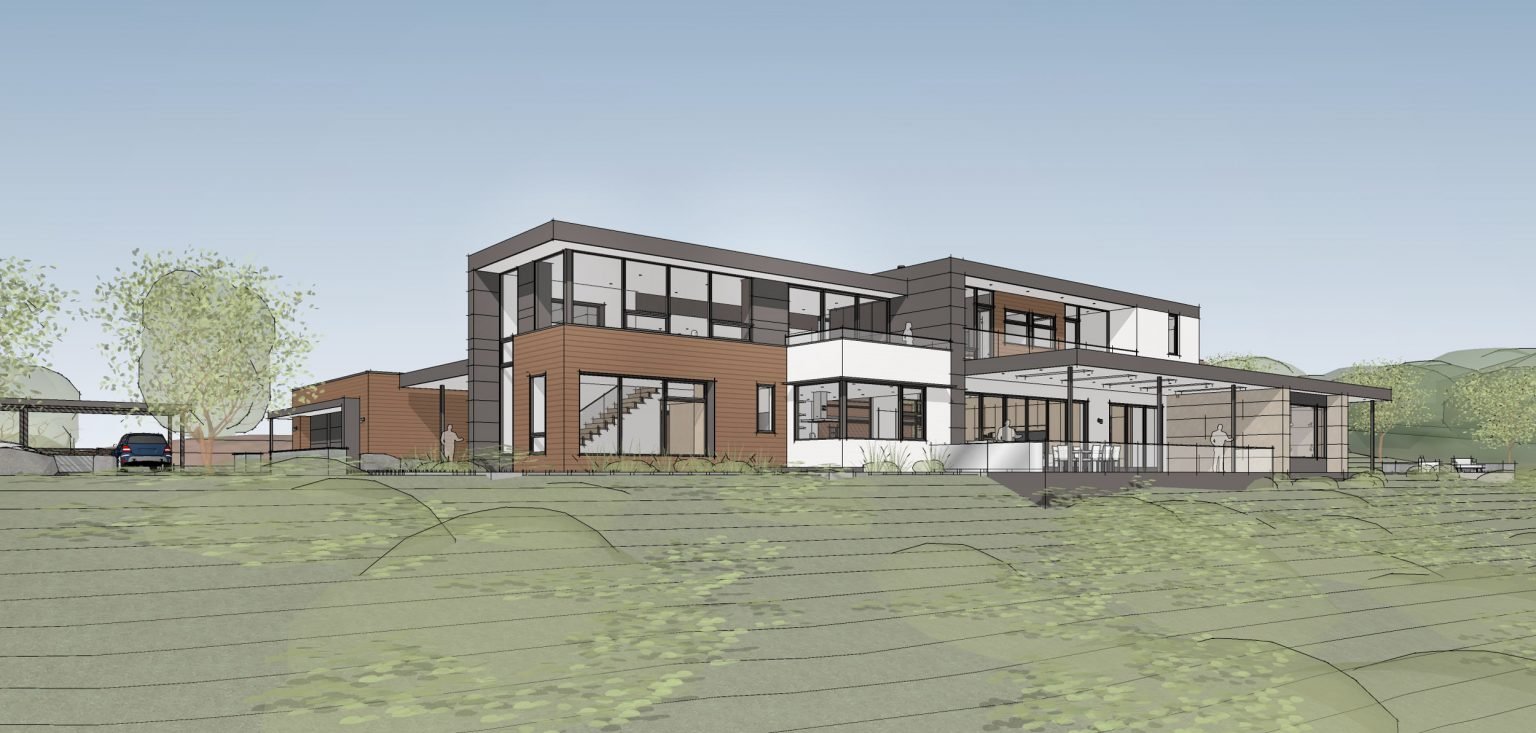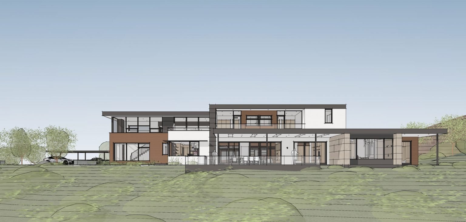 The house sits on one acre at the top of a low hill range overlooking Milpitas. The city was very cognizant of the importance of keeping a low profile at this crestline and required extensive story poles and photo evidence of the proper height and siting so as not to be seen from certain selected vantage points. The house construction has broken ground and is due for completion at the end of Summer 2020.