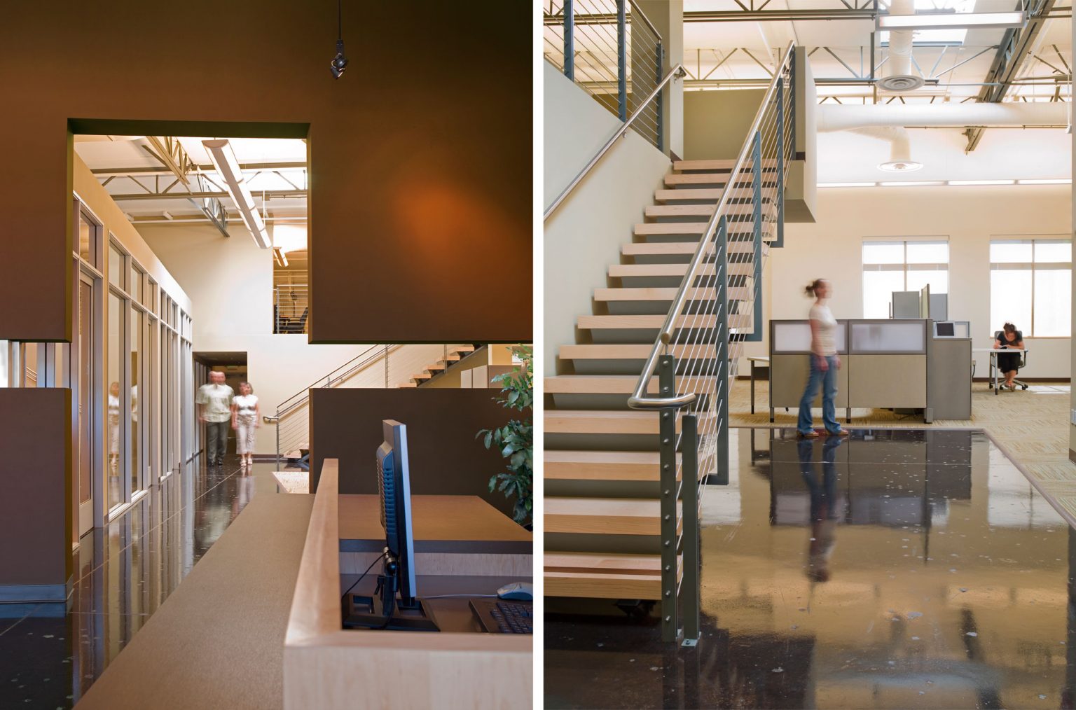 Navajo Company, an advertising and public relations firm serving the growing Silicon Valley high-tech industry, wanted an environment to reflect who they are—a space that is both high-tech, yet warm and inviting. Along with exposed structure, mechanical ducts and lighting, the lobby is enclosed by a sweeping curved wall cut with a narrow slot which provides a glimpse of the room that lies just ahead. The opening reveals the main conference room beyond. On axis to the entry, the view is down an angled wall of offices, with stairs to a new mezzanine beyond. From the conference rooms, selective views out reveal open office furniture and the company’s sign in the entry area beyond. The stainless steel stair with wood treads leads to the mezzanine offices.